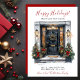 Esta aquarela Feliz Feriados, nova casa para o cartão de anúncio de feriados com uma porta vermelha festivamente decorada com árvores, uma coroa e arcos de feriados vermelhos seria perfeito para enviar para seus amigos e família agora que você se mudou para uma nova casa. O sentimento é personalizável. Basta para que todos que conheces e amamos tenham o teu novo endereço. Ficarão tão animados com a sua grande jogada!