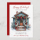 Esta rustica cor d'água Feliz Feriados é nova casa para o cartão de anúncio de feriados com uma porta de madeira festivamente decorada com arbustos e árvores de pínus, uma coroa, e arcos de feriado vermelhos seriam perfeitos para enviar aos seus amigos e família agora que você se mudou para uma nova casa. O sentimento é personalizável. Basta para que todos que conheces e amamos tenham o teu novo endereço. Ficarão tão animados com a sua grande jogada!
