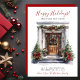 Esta melancolia Feliz Feriados, nova casa para o cartão de anúncio de feriados com uma porta de madeira decorada de forma festiva com pínus garland, árvores, uma coroa e arcos de feriados vermelhos seria perfeito para enviar para seus amigos e família agora que você se mudou para uma nova casa. O sentimento é personalizável. Basta para que todos que conheces e amamos tenham o teu novo endereço. Ficarão tão animados com a sua grande jogada!