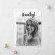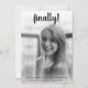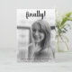 Cartão de anúncio de graduação moderno que apresenta "finalmente" em uma escrita negra grossa juntamente com o nome do formando e informações escolares sobre a sua foto vertical favorita. O fundo tem sua mensagem pessoal de preto sobre um fundo branco. Um design simples que faz da sua foto o recurso principal. Esta design funciona para um menino ou formando de menina.