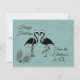 Dois flamingos face a face adornados com chapéus de natal e luzes prateadas em um pano de fundo azul-céu com estrelas prateadas reluzentes criando um cartão de natal mágico e divertido onde você pode personalizá-lo para torná-lo único seu.