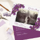 Uma maneira adorável de anunciar sua casamento. Este anúncio de elopemento de na moda apresenta lindas flores violetas roxas de aquarela com pontos falsos de respingos dourados que flanqueam a sua foto favorita de casamento. O texto dizia "Fizemos Uma Coisa! " mas pode ser mudado para a sua mensagem especial. A foto apresenta um filtro que pode ser alterado ou removido na ferramenta design. Adicione sua mensagem especial à família e aos amigos no verso.