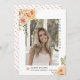 Folhas de pêssego Classe de anúncio de fotos de graduação em 2025. Uma design adorável que mostra uma foto, flores de pêssego nos cantos superior esquerdo e inferior direito, o texto "CLASSE DE 2025" em preto e coral e um boné de formatura cor-de-rosa coral. O verso inclui um padrão de bolinhas em coral e branco.