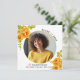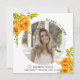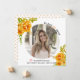 Flores laranja Classe de anúncio de fotografia de graduação de 2025. Um design adorável que mostra uma foto, flores cor d'água laranja nos cantos superior esquerdo e inferior direito, o texto "Classe 2025" em preto e rosa-quente e um boné de formatura rosa. O verso inclui um padrão de bolinhas em laranja e branco.