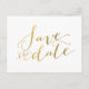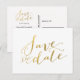 Glamor de folha de ouro invertido e impresso à frente Salve o cartão postal de data. Elke Clarke © Outras cores disponíveis em www.zazzle.com/monogramgallery. Um simples, mas versátil, dourado de guião manuscrito salva a data para casamentos ou outras ocasiões especiais, como jantas de ensaio, chás de casais, comemorações de aniversário de casamento. Folha de ouro é um efeito fotográfico impresso.