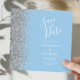A borda esquerda deste elegante casamento moderno salve o cartão de data apresenta uma borda cintilante. O texto personalizável combina manuscrito branco, fontes em copperplate e itálico em um fundo azul pastel de bebê. O verso apresenta um design azul-bebê e prata correspondentes.
