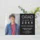 Mande a sua família e amigos este moderno anúncio personalizado de graduação de segundos graus fotográficos para rapazes ou raparigas. Este elegante design de modelo apresenta uma foto para você mudar para o seu à esquerda. À direita sobre fundo preto lê-se "Formando, Classe de 20XX" com seu nome, escola, data e planos futuros na falsa tipografia prateada. A parte de trás da carta é preta. Desenhado pela artista ©Susan Coffey.