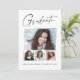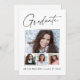 Cartões modernos, simples e elegantes de anúncio de graduação de "4 fotos", com design elementos do texto moderno, com um único roteiro de tinta de caligrafia. As fotos do formando são acentuadas com uma delicada e minimalista barreira de gradiente. A parte traseira do cartão oferece espaços de texto personalizados para informações sobre a sua graduação ou pode ser apagada se você quiser enviar uma mensagem. Preto e branco ou personalize facilmente o fundo para corresponder à cor primária da sua escola ou a qualquer cor da sua escolha. Perfeito para mais velho de segundos graus, universitários e universitários.