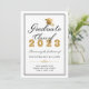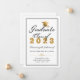 Anuncie sua formatura em estilo com este elegante cartão de anúncio personalizado. Esta design de tipografia apresenta as palavras Classe de Formando de 20XX com seu nome, escola e data para personalizar em ouro e branco acentuado por um boné de formando de ouro falso e enquadrado em preto. A parte traseira da placa é branca. Desenhada por Susan Coffey.