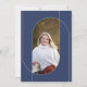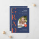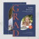 Este anúncio de graduação em forma plana de 5" x 7" e design de arco com duas fotos, uma na frente, outra na parte traseira das cores da escola, marinho azul e laranja queimado. Os espaços reservados incluem, nome do formando, nome do colégio ou da universidade, o tipo de escola, o diploma e uma linha adicional para informações adicionais, como honras especiais ou enfoque no grau.