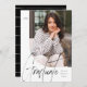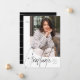 Comemore seu formando com este anúncio moderno de graduação de fotos em um esquema de cores preto e branco. Apresentando uma forma de foto exclusiva com uma borda curvada na frente, este anúncio de graduação também tem um ousado script moderno "formando" e texto personalizável para o nome e o ano do formando. A parte de trás preta apresenta e coordena a faixa, uma segunda foto e texto personalizável para planos futuros, convite da parte de formando e muito mais. Este anúncio original do formando de Lea Delaveris também está disponível como um convite festa de formatura e faz parte de uma coleção de anúncios de graduação, suprimentos partidários, decoração, presentes e muito mais. Encontre mais estilos e cores na coleção. Também disponível como download de anúncio de graduação digital!