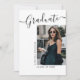 Este moderno e elegante cartão de anúncio de graduação simples, apresenta texto moderno com um roteiro elegante de caligrafia. A foto dos formandos destaca a frente do cartão, enquanto a parte traseira do cartão oferece espaços de texto personalizados para informações sobre a formatura e a viagem futura. Preto escrevendo em branco ou personalize facilmente o plano de fundo para uma cor de sua escolha. Para ver mais itens como este, visite minha loja aqui em "www.Zazzle.com/LakeViewCardCo". Obrigados