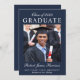 Anúncio simples e elegante do formandos azul-escuro apresentando uma foto do formando, seu nome e ano de aula em uma escrita branca e sua universidade, major e honra na tipografia branca moderna.