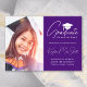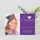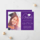 Envie a sua família e amigos um cartão de formandos personalizado único para os fazer. Este design modelo apresenta a sua fotografia personalizada à esquerda e à direita um boné de formando branco sentado sobre a palavra "Formando" escrito em uma fonte branca e escrita à mão. Personalize sua classe/ano, nome, grau e outros detalhes da cerimônia em um fundo roxo clássico. Desenhada por Susan Coffey.