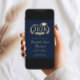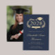 Anúncio de formandos azul escuro moderno com "Classe de" numa ilustração dourada clara de uma coroa de louros que incorpora um boné superior e um diploma de formando e o nome do formando numa elegante escrita dourada clara. Adicione sua escola, major, honras ou planos futuros. A foto deles preenche a parte de trás do cartão.