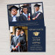 Anúncio elegante do formandos azul escuro com boné de ouro, a foto do formando, seu nome na tipografia clássica da serifpografia de ouro e sua escola, major, honors ou planos futuros. No verso, adicione mais 3 fotos e sua mensagem de anúncio personalizada.
