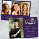 Anúncio formal do formandos roxo com "Classe de" numa ilustração da coroa de louros que incorpora um boné de formando de ouro e um diploma, uma fotografia do formando e o seu nome numa elegante escrita de ouro. Adicione sua escola, major, honras ou planos futuros na tipografia clássica da serifpografia de ouro. No verso, adicione 3 fotos adicionais e sua mensagem personalizada.