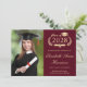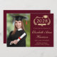 Anúncio moderno de formandos vermelho burgundy com "Classe de" numa ilustração clara dourada da coroa de louros, um boné superior e um diploma, uma fotografia do formando e o seu nome numa elegante escrita dourada. Adicione sua escola, major, honras ou planos futuros.