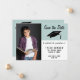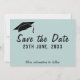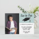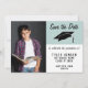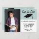 Graduação Azul Moderno Salve o Cartão de Anúncio de Foto de Data. Moderno salve o cartão de data para anunciar a festa de formatura do seu formando. A placa está em azul e branco e inclui um boné de formatura. O design tem texto de tendência - personalize todo o texto do cartão com seus dados e um modelo de foto - insira a foto do formando no modelo. Altere a data e outro texto na parte traseira do cartão.