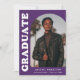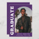 Anúncio de graduação de na moda e tendência apresentando a foto do formando na frente com um quadro de fotos de arco de offset. O "Formando" é apresentado em caracteres branco a negrito, com a inscrição retrorreflectora sobre um fundo roxo. Personalize a frente do anúncio de graduação em fotos de arco adicionando o nome do formando, a escola e o ano de graduação. O cartão se reverte para exibir 3 fotos adicionais com espaço para texto personalizado, como futuros planos de faculdade, planos de carreira, detalhes de festa de formatura, etc. O anúncio de formatura roxa é perfeito para formandos de segundo grau e de faculdade.