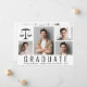 Anúncio de graduação da faculdade de direito moderno com uma ilustração das escalas da justiça, uma colagem de 4 fotos, "Formando" escrito por baixo em letras grandes e seu nome, faculdade de direito e ano de aula em tipografia simples. No verso, adicione uma foto adicional e uma mensagem personalizada.