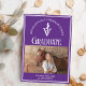 Este cartão de anúncio de graduação de escola veterinária roxa personalizado apresenta tipografia branca para uma classe de formando 2025 acima da foto de seu aluno. Personalize com o seu ano de graduação sob o caducilo médico veterinário e fotografe para um cartão veterinário personalizado do excelente.