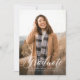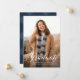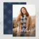 Este anúncio de formatura simples e clássico apresenta uma grande foto vertical e a palavra "graduado" em letra cursiva branca, além de espaço para nome, ano e outros detalhes da escola. O apoio xadrez coordenado é um azul marinho clássico.