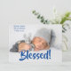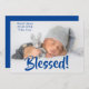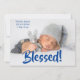 "Abençoada" fotografia de recém-nascido. Azul escuro para o bebê. Adicione o nome do bebê e as estatísticas de nascimento. Que adorável anúncio de nascimento para apresentar seu querido filho.