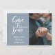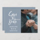 Escrito branco moderno, Salva o Cartão com fotos de Data do Casamento. Recursos, fundo cor azul empoeirado chic e modelo de foto de solteiro na frente.