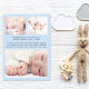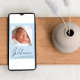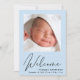 Um simples e fofo anúncio de nascimento de um bebê azul pastel. A frente apresenta a foto do seu recém-nascido, o nome do cheio, a data de chegada e as estatísticas de natalidade, e "Bem-vindo" em um roteiro de na moda. No verso, adicione três fotos adicionais e nomes de pais e irmãos, e um obrigado para você, visitação ou outra mensagem.