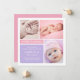 Apresente a sua nova menina à família e aos amigos em estilo com esta design de nascimento moderna e de blocos coloridos. O cartão quadrado inclui três cartazes para mostrar as suas fotos favoritas de recém-nascidos, um esquema de cor roxo, rosa e branco de lavanda e um pop de cor rosa no verso do cartão.