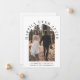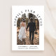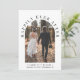 Elegante anúncio de casamento íntimo ou convite para recepção. A frente apresenta a foto do seu casamento em uma moldura arqueada e "Felizes para Sempre" em tipografia elegante. Adicione seus primeiros nomes, data e local do casamento. No verso, personalize o anúncio do casamento e os detalhes da recepção e adicione seus nomes em uma caligrafia semelhante a uma assinatura.