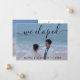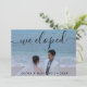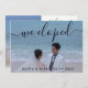 Anuncie o seu casamento recente para familiares e amigos! Este design de cartão de anúncio de casamento moderno apresenta uma foto horizontal do novo marido e esposa na frente com um "Fugimos!" em letra branca pincelada