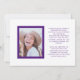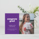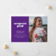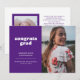 Anuncie a grande conquista do seu graduado com este simples mas elegante anúncio de formatura. Ele apresenta as palavras "congrats grad" em uma fonte estilo retrô branca em um fundo roxo, bem como espaços para uma foto na frente e no verso. O verso do anúncio também tem espaço para uma nota pessoal sobre o graduado, incluindo planos futuros.