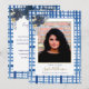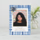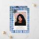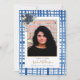 Um belo anúncio de formatura feminina para celebrar um marco especial! Este design apresenta um fundo de xadrez azul de cor d'água com sotaques azuis e dourados e um espaço reservado para sua foto.