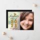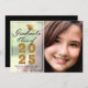 Anuncie sua formatura em estilo com este elegante cartão de anúncio personalizado de fotos. Este design tem sua foto à direita e à esquerda é uma camada com um design de tipografia com as palavras Classe de Formando de 2025 com seu nome e escola para personalizar em ouro e roteiro preto, acentuado por um falso boné de formando de ouro. A parte de trás da carta é preta. Desenhada por Susan Coffey.