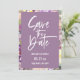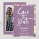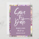 Escrito branco moderno e quadro floral de cor d'água roxa, Casamento Salve o Cartão com fotos de Data. Recursos, fundo poeirento de cor de lavanda e modelo de foto de solteiro no verso.