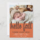 O anúncio de um belo parto de outono mostra uma foto do seu bebê recém-nascido na metade superior. A metade de baixo é uma laranja temperada profunda. Hello Fall é escrito em uma fonte de script moderno em roxo profundo. O nome do bebê está escrito no mesmo roxo. Seus estados de aniversário e nascimento estão em um texto simples e branco. Envie-me uma mensagem se precisar de produtos correspondentes.