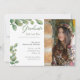 Impressione seus convidados com a beleza da natureza. Ramos de buxo em aquarela no topo e no canto inferior esquerdo com foto à direita. O script verde "Graduate" acentua a beleza natural e o verde escuro sólido no verso.