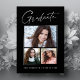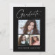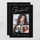 Cartões de anúncio de graduação "3 fotos", limpos, modernos e elegantes, com design elementos do texto moderno com um único roteiro de tinta para a caligrafia. As fotos do formando são acentuadas com uma delicada e minimalista barreira de gradiente. A parte traseira do cartão oferece espaços de texto personalizados para informações sobre sua graduação. Preto e branco ou personalize facilmente o fundo para corresponder à cor primária da sua escola ou a qualquer cor da sua escolha. Perfeito para mais velho de segundos graus, universitários e universitários.
