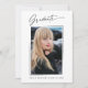 Cartões modernos, elegantes e modernos, com design de elementos do texto moderno com escrita de tinta de caligrafia. A foto do formando na frente da placa é realçada com uma delicada e minimalista placa de gradiente. A parte traseira do cartão oferece espaços de texto personalizados para informações sobre a sua graduação ou pode ser apagada se você quiser enviar uma mensagem. Preto e branco ou personalize facilmente o fundo para corresponder à cor primária da sua escola ou a qualquer cor da sua escolha. Perfeito para o segundo grau, universitário e estudante de formando universitário.