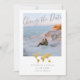 A foto muda o cartão de anúncio de data para um casamento de destino ou tema de viagem que teve que ser reagendado ou adiado com tipografia mínima e moderna, e um mapa do mundo do ouro com localização cardíaca editável no verso. Clique em PERSONALIZAR AINDA para mover o coração ou alterar as fontes.
