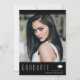 Cartões de anúncio de graduação em na moda, com texto moderno com aparência elegante e profissional. A foto dos formandos na frente da placa é aprimorada por quadros translúcidos finos na parte superior e inferior, enquanto a parte traseira da placa oferece espaços de texto personalizados para informações sobre a graduação e a viagem futura. Os fundos são pretos com texto branco na frente e tons regais de cinza e preto no verso. Para ver mais itens como este, visite minha loja aqui em "www.Zazzle.com/LakeViewCardCo". Obrigados