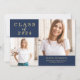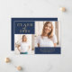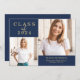 Este cartão de anúncio de graduação simples e na moda apresenta duas das suas fotos pessoais favoritas da classe do formando 2023, juntamente com o texto elegante clássico e o guião falsa em ouro num fundo azul marinho para um olhar minimalista espantoso.