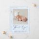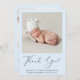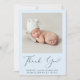 Mínimo anúncio de nascimento de um bebê azul e cartões de agradecimentos com a foto de seu recém-nascido e "Obrigado" em um roteiro elegante com uma batida cardíaca. Personalize com seu nome, data de chegada e estatísticas de nascimento em uma simples tipografia moderna. No verso, adicione uma foto adicional e sua mensagem personalizada e obrigado.
