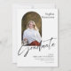Este anúncio de graduação em formato plano de 5" x 7" apresenta uma foto em forma de arco na frente, em um fundo de marfim, com letra preta. Os marcadores incluem, nome do formando, nome da universidade ou universidade, o grau, a área de foco do grau e uma linha adicional para informações adicionais, como honras especiais.