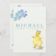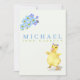 Nosso cartão de anúncio de nascimento de foto fofa apresenta seu lindo bebê menino com o nome dele na frente com flores azuis suaves e um pato amarelo fofo. Personalize o verso com uma foto de recém-nascido e texto em itálico para destacar as informações importantes de nascimento do seu bebê e os nomes dos pais. A foto é emoldurada por uma moldura azul suave encimada por flores azuis e roxas em aquarela.