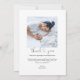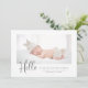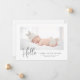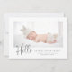 Um simples e na moda de carta de modelo de anúncio de nascimento com dois lados apresenta uma foto do seu bebê ou menina recém-nascido, mensagem personalizada que pode ser personalizada, texto tipográfico com letra de mão que diz "Olá" com um obrigado de script que você e o coração estão entre nós — acima de sua mensagem no verso. Você pode personalizar o nome do bebê e as estatísticas na frente e obrigado sua mensagem na parte traseira do cartão. Um lugar para uma segunda foto atrás. ©Marisu Valencia