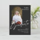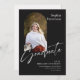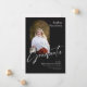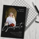 Este anúncio de graduação em forma plano de 5" x 7" apresenta uma foto em forma de arco na frente, em um fundo preto, com letras brancas. Os marcadores incluem, nome do formando, nome da universidade ou universidade, o grau, a área de foco do grau e uma linha adicional para informações adicionais, como honras especiais.