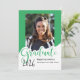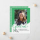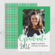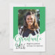 Este anúncio de graduação de fotos reluzente apresenta a palavra "formando" em letras grandes verdes com um lugar para sua foto favorita. O verso é um design de bolinhas verde e branco.